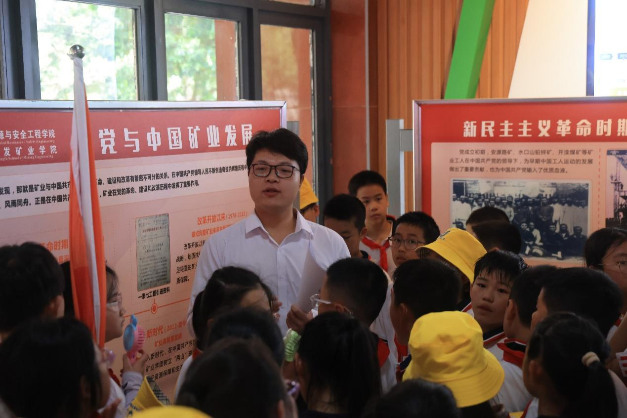 随后,在党员志愿者的带领下,队伍抵达领创大楼,志愿者变身“红色展厅讲解员”,依托丰富图文资料,全面系统地讲述党与中国矿业发展的历史背景与脉络。讲解生动细致,让孩子们在沉浸式体验中,将理论知识内化为对中国精神的深刻感悟。