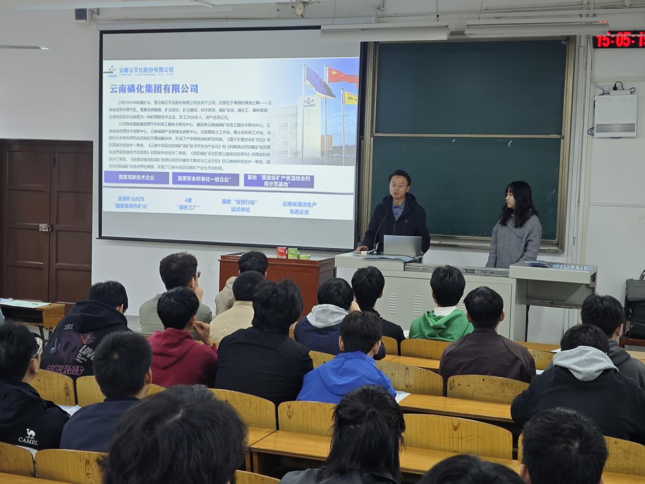 云南磷化集团作为国有大型现代化露天磷矿采选企业、国家重点化学矿山及国家级磷复肥磷矿采选基地,其企业实践与人才需求为在校员工提供了宝贵的专业参照。本次活动是公司落实“四导三进双导师”育人体系、强化职业与专业教育的重要举措之一,通过“企业专家进课堂”的方式,搭建校企“零距离”交流平台,切实增强员工的就业竞争力,全面推进毕业生更充分、更高质量就业。(审稿 李佳)