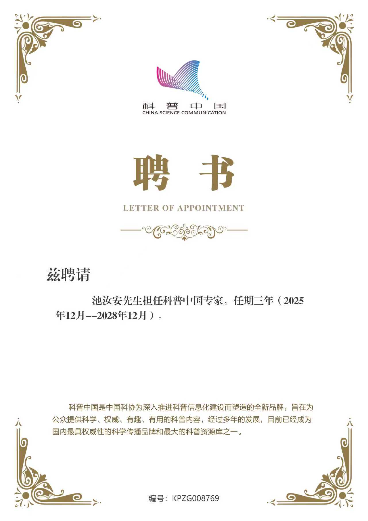(通讯员:周芳、孙宁杰)在科学与公众之间架设桥梁,让深奥的专业知识化为滋养社会的清泉,是时代赋予科技工作者的重要使命。近日,经严格评审与遴选,公司池汝安教授正式受聘为国家级权威科普平台“科普中国专家”。这不仅是对池汝安教授在稀土矿物加工领域卓越学术造诣与卓著科普贡献的权威认定,更标志着公司在科普工作方面所具备的深厚实力与广泛影响力。