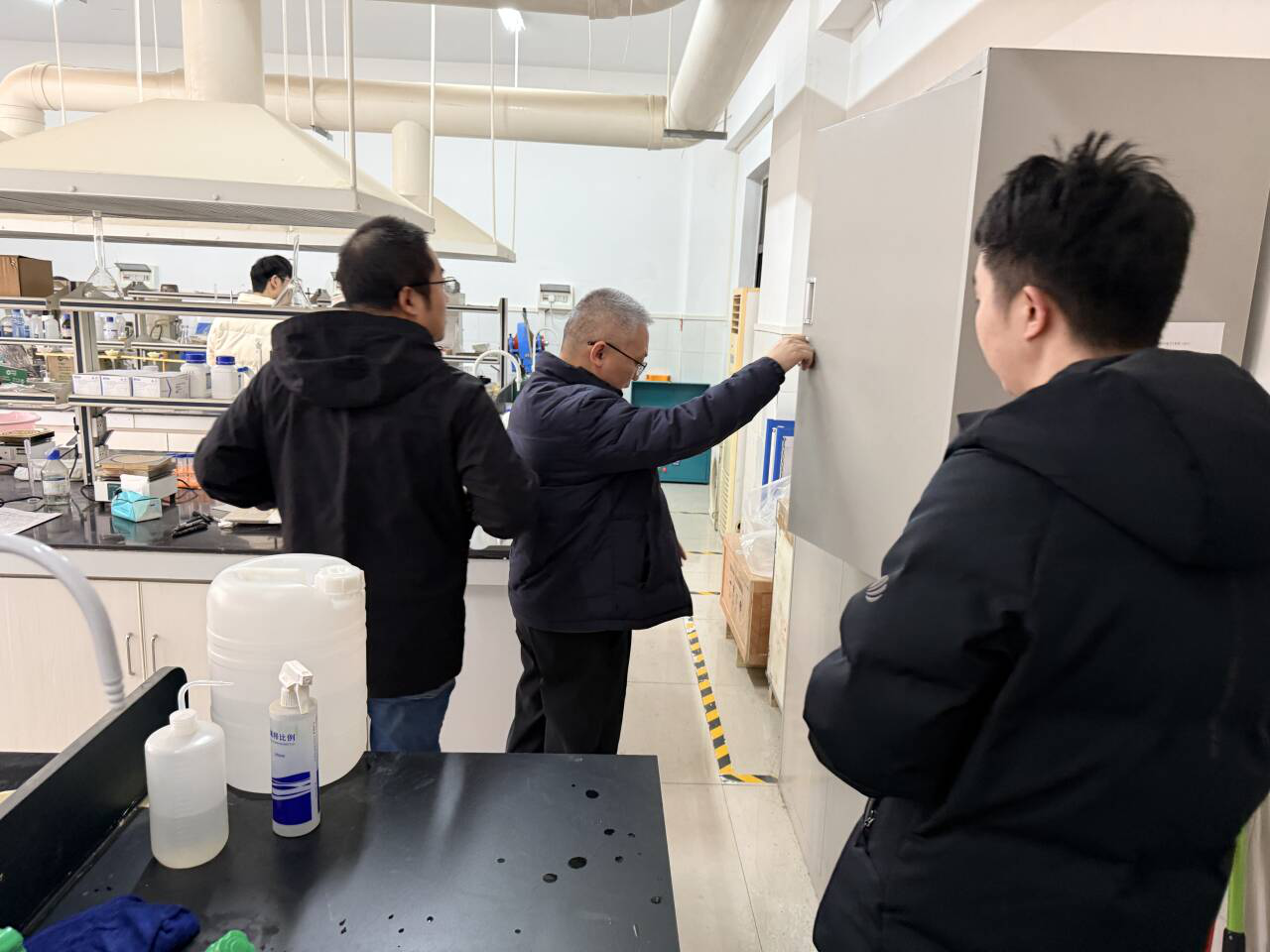 本网讯(通讯员 邓祥意)近日,为全面贯彻落实公司安全管理要求,深入推进实验室危险化学品“未巡先改”专项工作,切实消除潜在风险隐患,公司于2025年学期末组织开展了专项安全隐患检查,由何东升经理、李志国副经理带队,组织公司安全管理员形成检查小组,重点检查公司各实验室危险化学品的存放、管理及使用情况。
