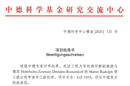 本网讯(通讯员杨丙桥)近日,国家自然科学基金委员会中德科学中心公布了2021年中德合作项目的资助名单,公司杨丙桥副教授与德国亥姆霍兹德累斯顿罗森多夫研究中心Rudolph Martin博士联合申报的“德国优秀青年基金项目(长期)”正式获批立项,项目获批经费44万,项目编号GZ1693,该项目研究周期三年。