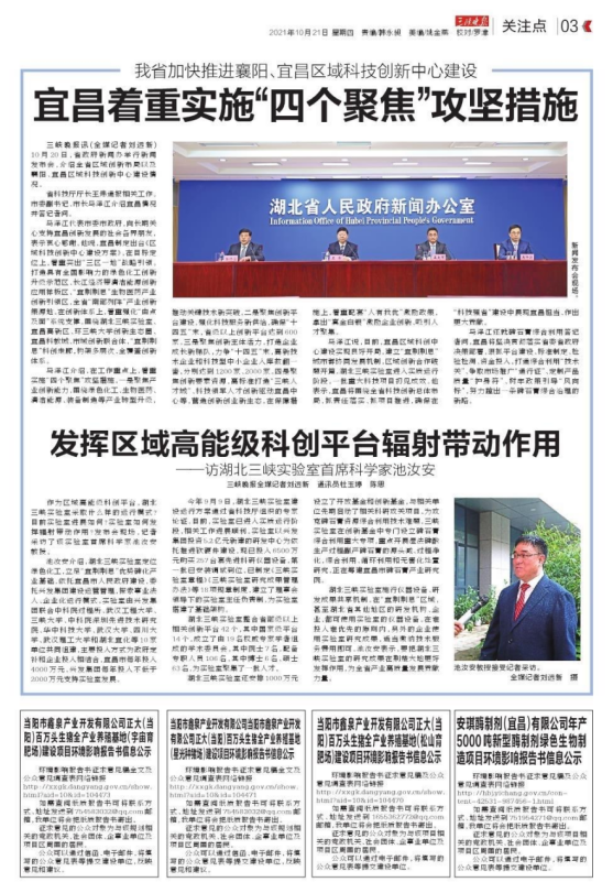 10月20日,湖北省政府新闻办召开发布会,发布推进襄阳、宜昌区域创新中心建设有关情况,beats365beats365官方网站经理、三峡实验室首席科学家池汝安教授受邀出席新闻发布会并回答记者提问。《湖北日报》、《科技日报》、《中国科学报-科学网》、《三峡晚报》、《中国化工报》等多家新闻媒体播发通讯,聚焦三峡实验室致力于解决磷石膏综合利用世界性难题。