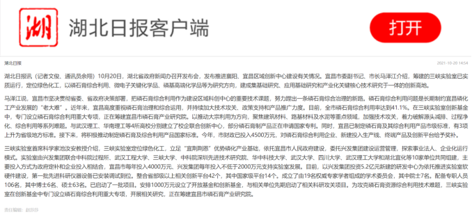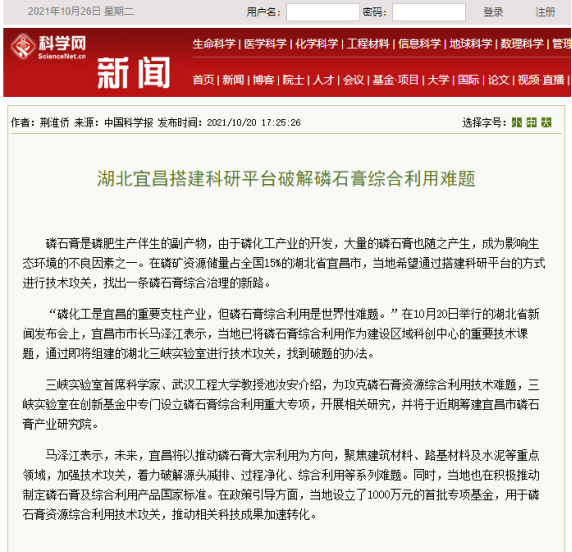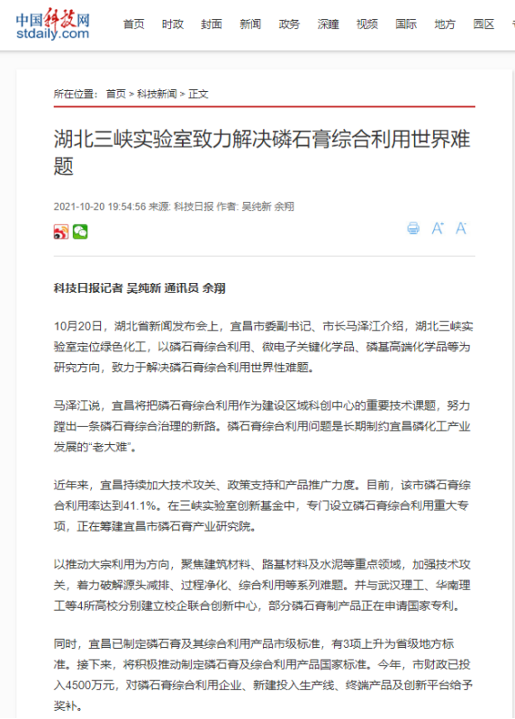 10月20日,《湖北日报》刊发题为《三峡实验室瞄准磷石膏综合利用世界性难题》的报道,《科技日报》刊发《湖北三峡实验室致力解决磷石膏综合利用世界难题》的报道,《中国科学报-科学网》报道了《湖北宜昌搭建科研平台破解磷石膏综合利用难题》。10月21日,《三峡晚报》刊发题为《发挥区域高能级科创平台辐射带动作用》通讯报道。10月25日,《中国化工报》刊发题为《定位绿色化工!三峡实验室瞄准磷石膏综合利用世界性难题》通讯报道。