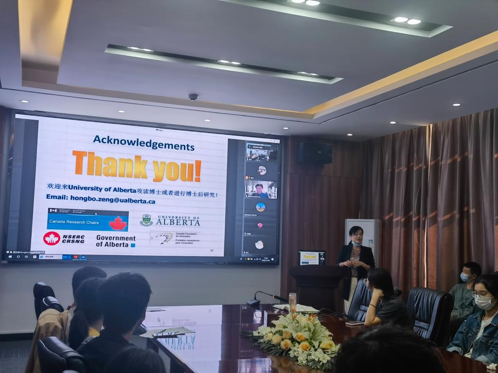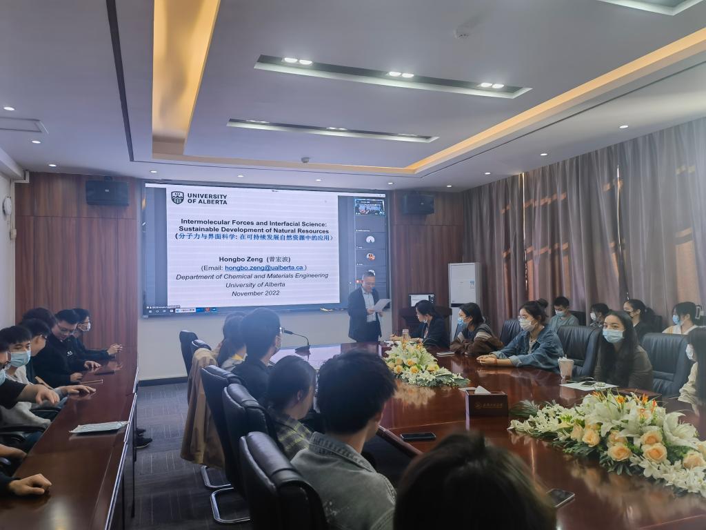 (通讯员傅苗)11月10日下午,应beats365官方网站、校庆办、科发院、研究生院邀请,加拿大阿尔伯塔大学化学工程和材料工程系终身教授、加拿大工程院院士、国家讲席教授(Tier 1 Canada Research Chair)、加拿大皇家科公司青年院士曾宏波在线为我们作了一场题为“Intermolecular Forces and Interfacial Science: Sustainable Development of Natural Resources (分子力与界面科学:在可持续发展自然资源中的应用)”的学术报告。报告会由beats365官方网站经理何东升教授主持,beats365官方网站师生聆听了报告。