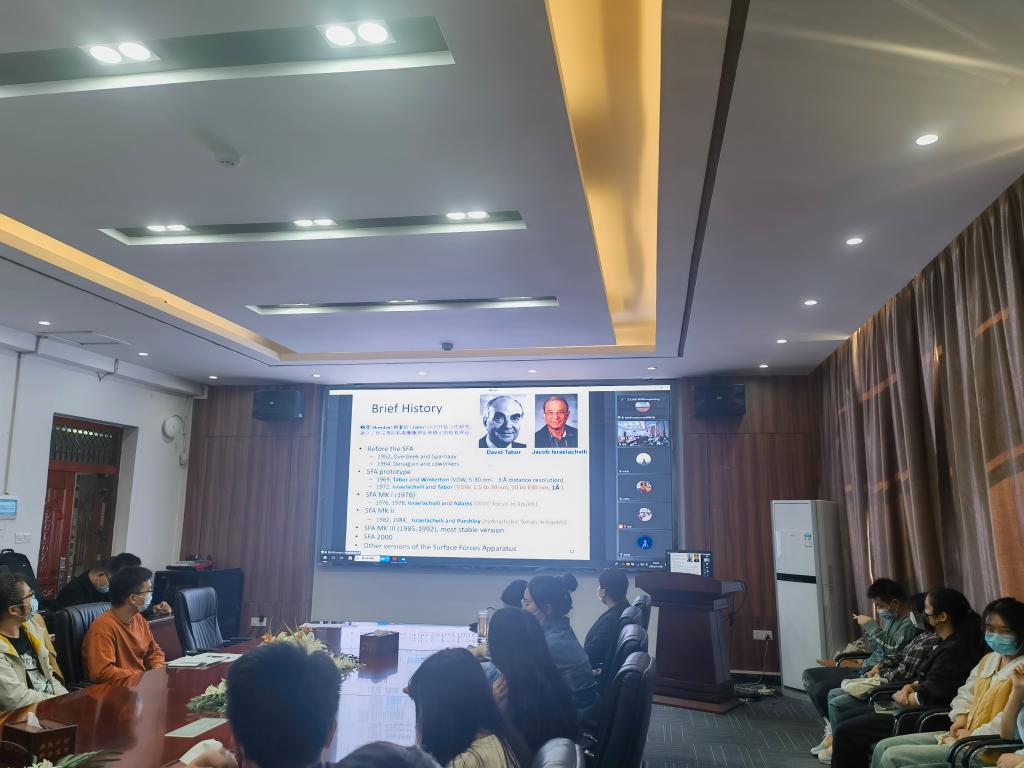 曾教授介绍了分子力与界面科学的发展历史、基本原理以及相关重要的检测设备,同时将基础理论研究应用于实际生活中,列举了分子力与界面科学在实际生活中的应用案例,阐明了分子力与界面科学研究的重要意义。