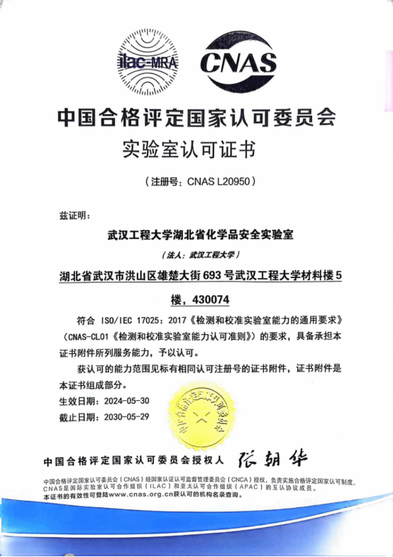 近日,接中国合格评定国家认可委员会(CNAS)通知,湖北省化学品安全实验室正式获批CNAS实验室认可证书(注册号CNAS L20950),跻身《国家实验室认可名录》。