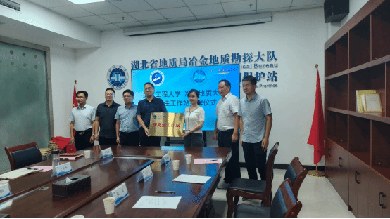 本网讯(通讯员 张 龙) 7月11日,公司副经理周芳教授、采矿工程教研室张龙老师及一名研究生赴湖北省地质局冶金地质勘探大队(以下简称“冶金地质大队”)开展产学研合作洽谈活动暨研究生工作站揭牌仪式。冶金地质大队党委书记、队长杨潇,副队长王水华,副队长石威,十堰环境地质中心主任于义军,黄石环境地质中心主任陈伯恒等参加座谈交流会。黄石市自然资源和规划局开发区·铁山区分局副局长王福彬,地灾科长杨燕翔等列席座谈会。