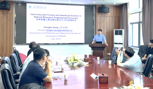 报告中,曾宏波详细介绍了矿产资源、环境工程、化工和生物化工过程中分子力与界面现象的机理,并通过生动的案例展示了这些科学原理在矿物浮选、冶金工程、尾矿综合利用、软物质材料、自修复材料、自清洁材料、油水分离、电池粘结剂、可穿戴电子器件等功能材料开发中的重要作用。他还同青年教师及同学们交流了分解科学问题并建立可行的研究方法,希望大家能高效开展学术研究。在师生提问环节,曾教授耐心解答了各类学术问题,介绍了阿尔伯塔大学科研底蕴、平台和学科优势,以及前往该校访学交流的要求和途径,并邀请公司师生前往交流学习。
