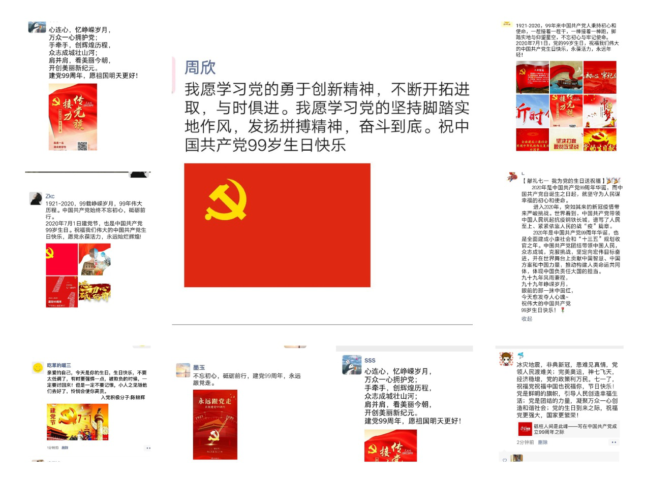 2020年7月1日是中国共产党成立99周年纪念日,beats365官方网站全体员工党员开展了以“我为党的生日送祝福”为主题活动。活动共征集来自基层党支部、入党积极分子的微信朋友圈和手写祝福短语等形式作品178篇。