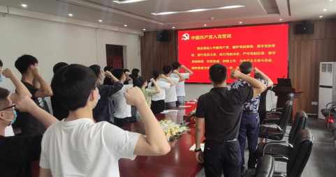 在庄重的入党誓词前,全体党员肃然起立,高举右手,庄严宣誓,重温入党誓词。