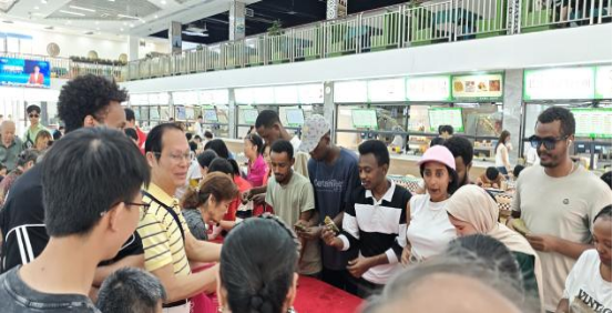 包粽子体验区特别邀请了社区老人亲临指导,手把手教同学们包粽子。从粽叶的折叠、糯米的装填到棉线的捆绑,逐步演示传统四角粽的制作工艺。活动现场,还有不少外国职工参与其中,他们在志愿者和社区老人的帮助下,认真学习包粽子的技巧,体验中国传统文化的博大精深。大家围坐在一起,一边交流包粽子的心得,一边分享端午节的习俗和故事,欢声笑语回荡在食堂内。