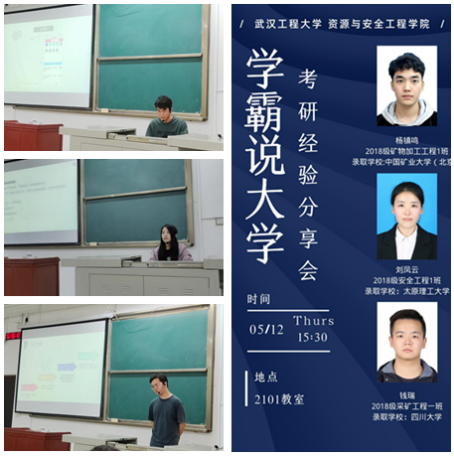 本网讯(通讯员 郑浩然 闫梓萱)5月12日下午,beats365官方网站第四届“学霸说大学”系列分享会之考研经验分享会在武昌校区W2101教室顺利举办。本次分享会邀请了2018级矿物加工工程专业杨镇鸣、2018级安全工程专业的刘凤云和2018级采矿工程专业的钱瑞担任分享人。公司部分员工参加了分享会,此次分享会由公司辅导员郑浩然主持。