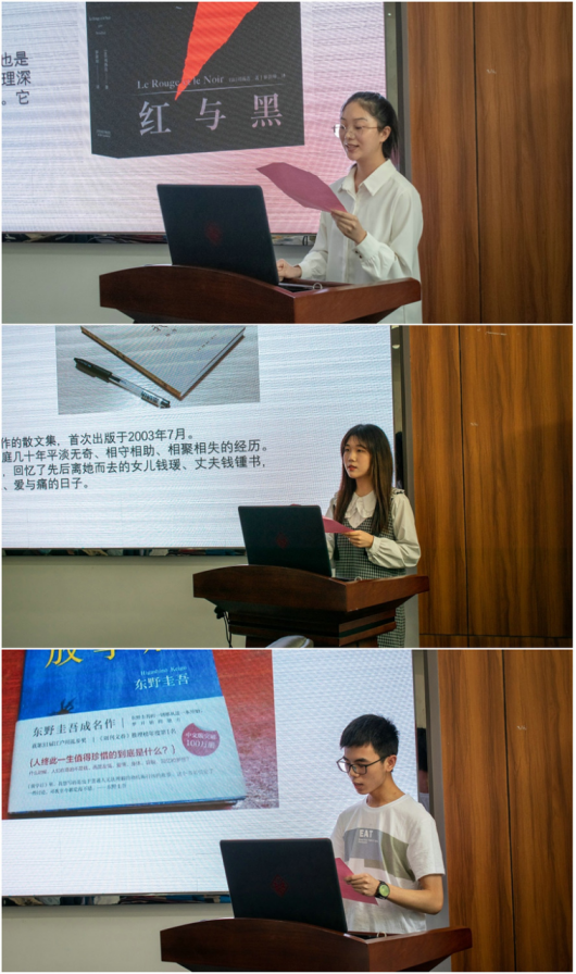 在读书分享会上,2021级安全工程2班周唯一、2021级安全工程1班李立涛、2021级安全工程3班邓玉芳分别分享了阅读书目杨绛的《我们仨》、东野圭吾《放学后》和司汤达《红与黑》,3位分享嘉宾从不同的角度饱含深情地分享了读书带来的深刻感悟,精彩内容和经典片段,让参会的师生享受了一场精神盛宴。