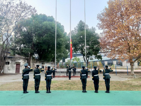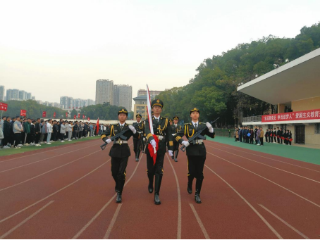 7:00,国旗护卫队护卫着五星红旗,迈着铿锵有力、整齐划一的步伐护送国旗入场。在雄壮嘹亮的国歌声中,鲜艳的五星红旗迎着朝阳冉冉升起,全体师生行注目礼,满怀深情向国旗致以最崇高的敬意。