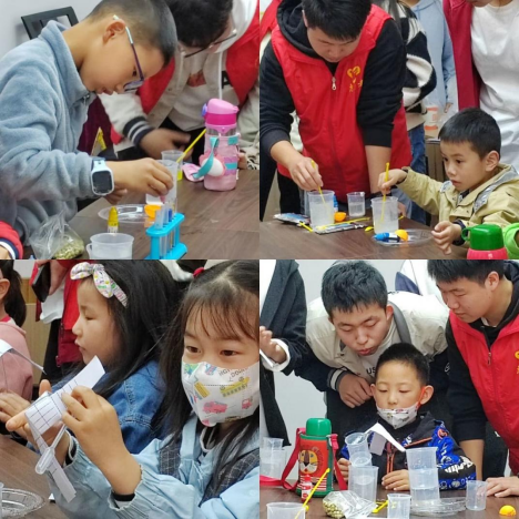 活动过程中,回顾完“色彩喷泉实验”后,科学小老师、志愿者、社区小朋友一起合作完成了“制作水精灵”和“制作小风车”科学小实验。科学老师做示范实验后,每名志愿带领2位小朋友,利用海藻酸钠,乳酸钙,水,各种配饰,闪粉,颜料等道具制作“水精灵”,剪刀,卡纸,胶棒等制作风车。最终小朋友们独立完成科学小实验。