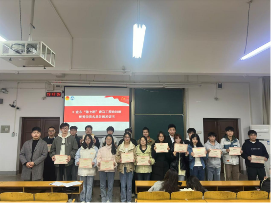 团委副书记(员工)乔仕元宣布优秀学员名单。团委指导老师耿胡锐为第七期“青马工程”培训班优秀学员颁发优秀学员证书。