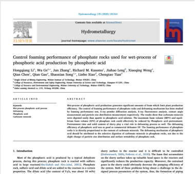 Ⅱ.第三作者参与合著SCI论文《Control foaming performance of phosphate rocks used for Wet-Process of Phosphoric Acid Production by phosphoric acid》于一区期刊《HYDROMETALLURGY》,影响因子3.46。