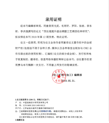 Ⅲ.第四作者合著中文核心论文《预处理提升湿法磷酸工艺回收磷回收率研究》于《化工矿物与加工》。