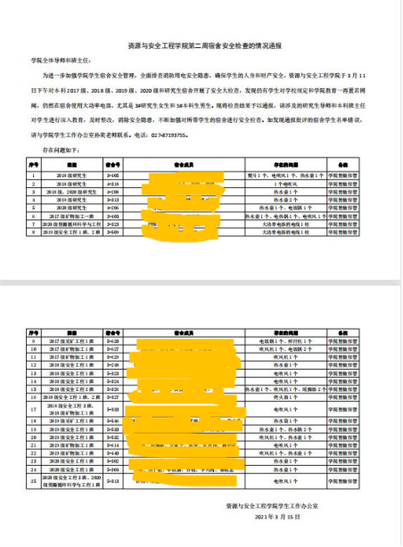 宿舍是员工学习生活的重要场所,为消除员工宿舍安全隐患,规范用电安全。从3月份起,公司实行员工宿舍安全周检查通报制度,由公司员工工作办公室老师带队对全院在校员工宿舍进行了安全大检查,对于存在安全隐患问题的宿舍现场整改,并对涉及的宿舍成员予以通报批评。