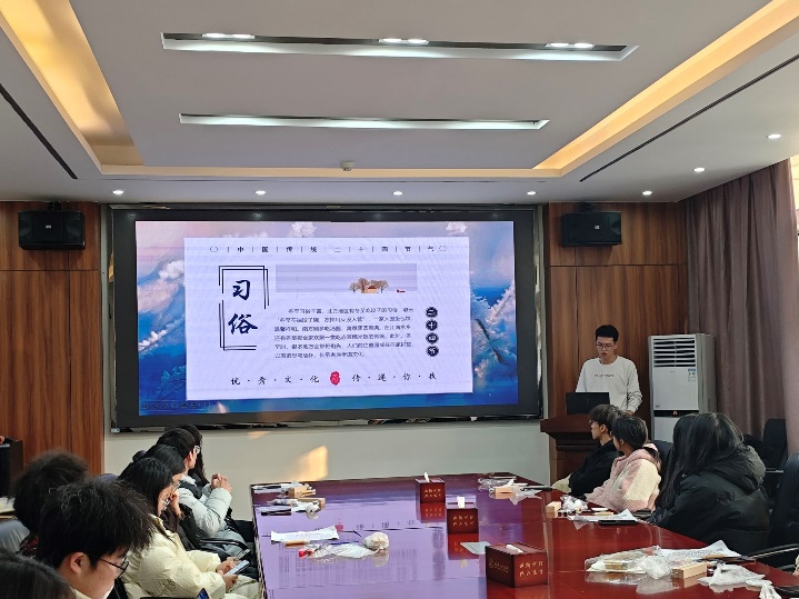 活动伊始,协会成员谢亮通过PPT向同学们介绍了冬季节气的起源与发展、节气文化及其相关的民谚民俗。