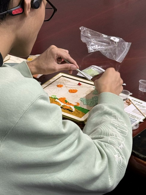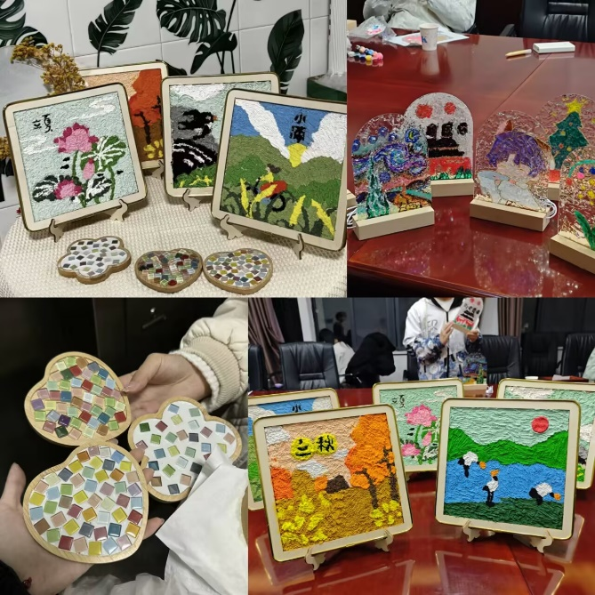 随后,进入手工制作环节,此次特别准备了玻璃灯画、马赛克杯垫以及非遗纸浆画三项内容供同学们选择体验。每一种手工制品都蕴含着深厚的文化底蕴,参与者们分组合作,用心地将材料组合成一幅幅精美的作品,每一笔、每一划都倾注了他们对传统文化的热爱与敬意。